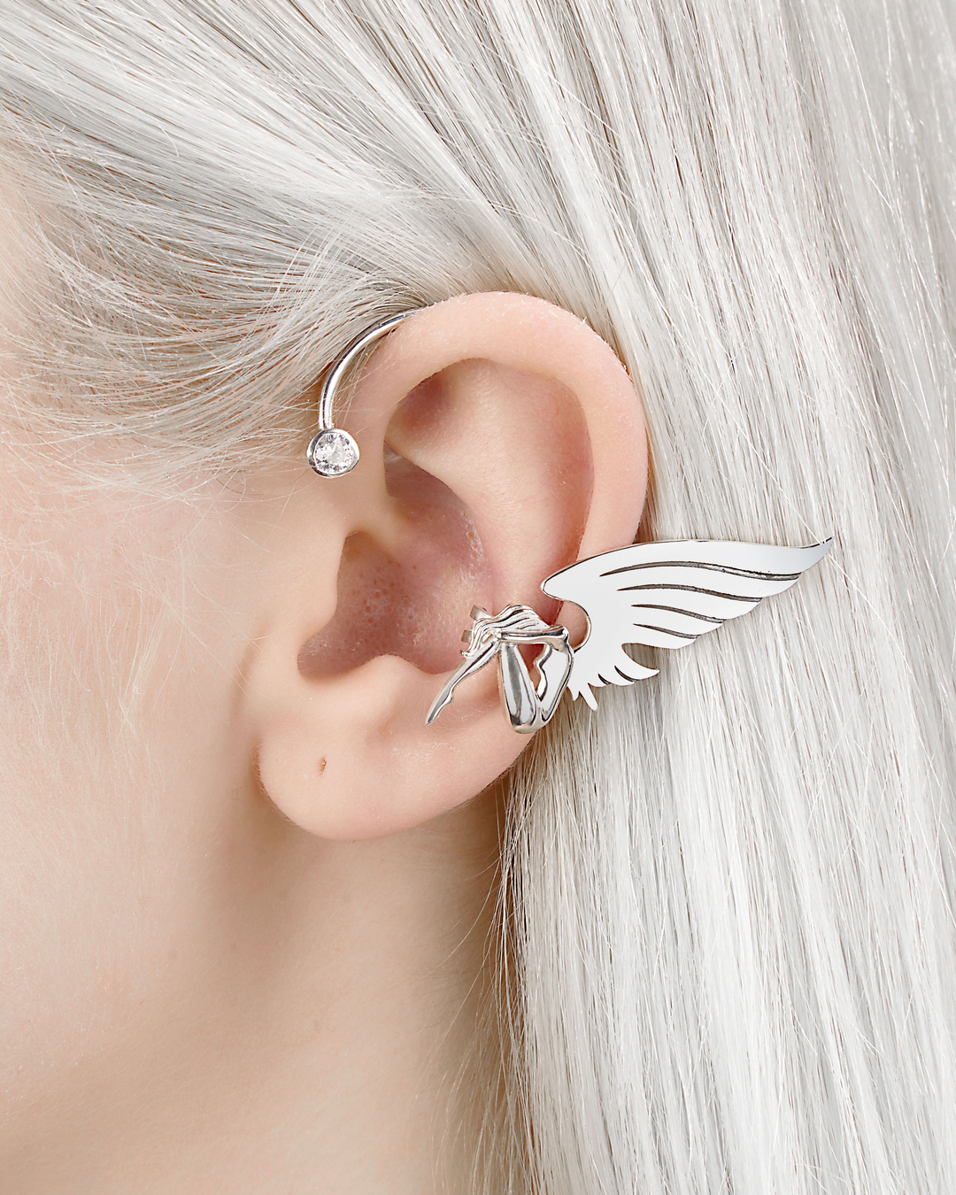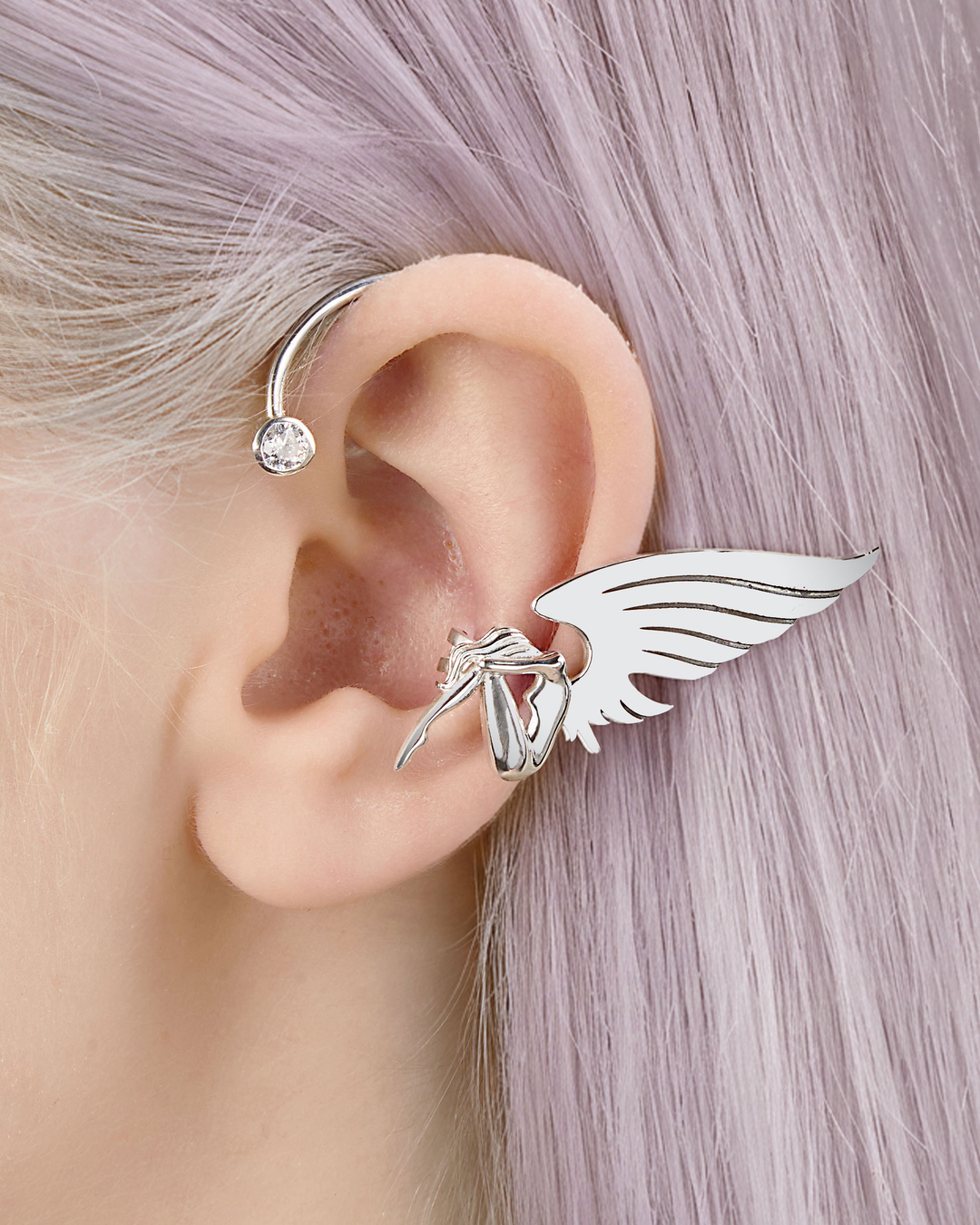 Angel wing ear cuff crafted from 925 sterling silver features a delicate angel figure with a single wing and a clear cubic zirconia accent. The clean silhouette and polished finish give the piece a refined, modern look with subtle fantasy symbolism.