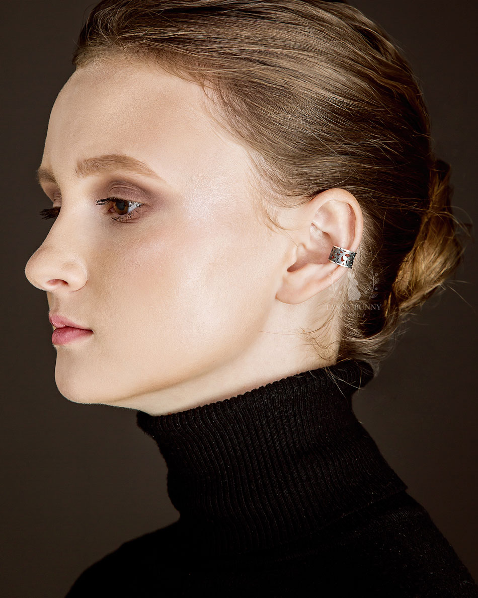 The black ear cuff is made of 925 sterling silver and decorated with an openwork oxidized pattern. The contrast between the polished edges and the darkened center gives the piece a clean, expressive look that suits many styles.