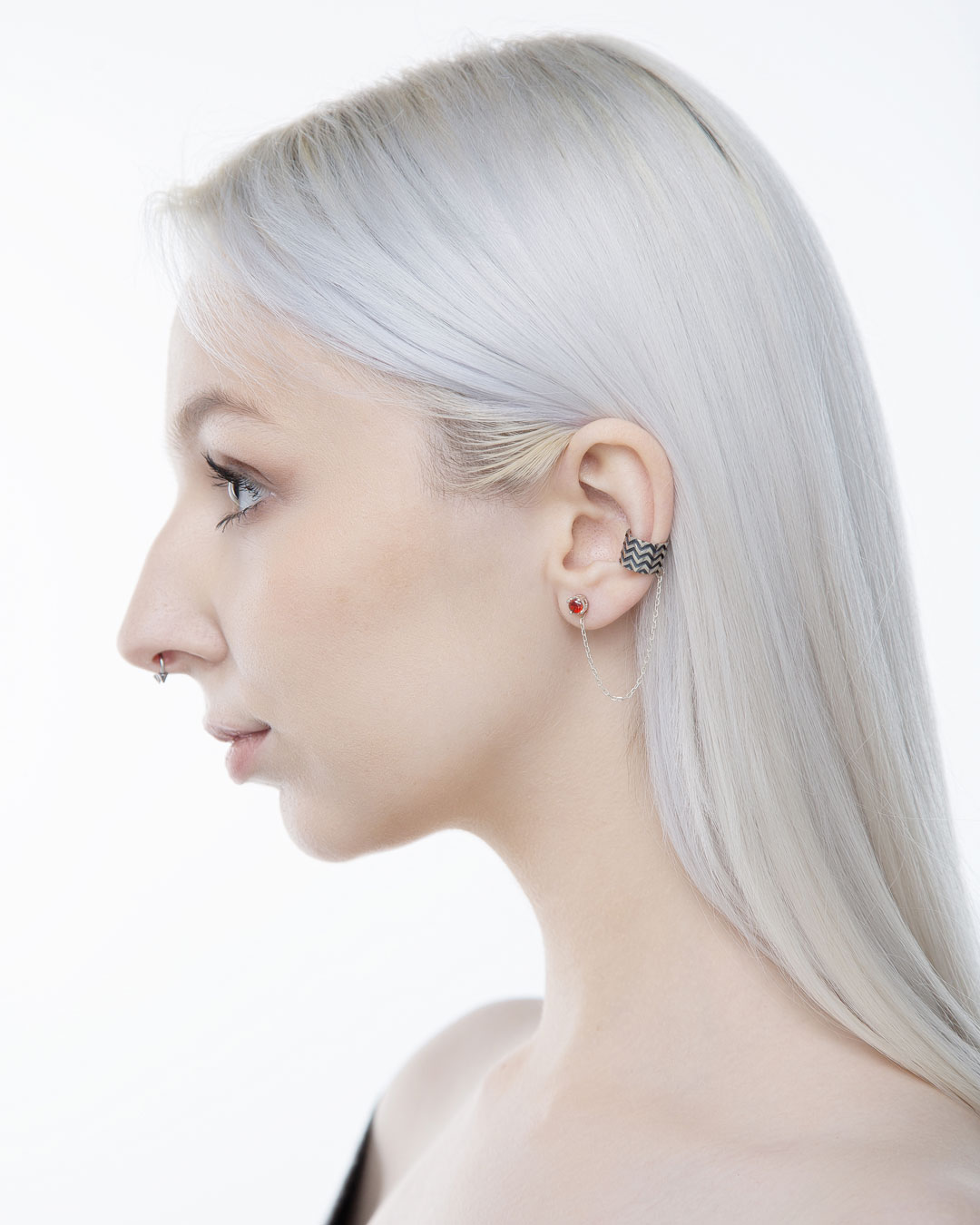 A fine chain connects the cuff with a small stud earring set with a red cubic zirconia. The second stud matches the first one, so you can wear them as a pair or separately. The chevron chain ear cuff is available for the left ear or for the right ear.