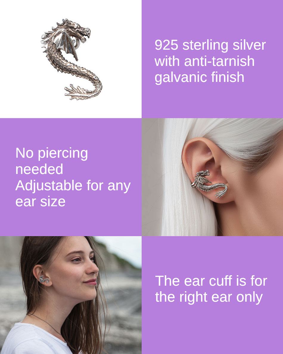 This silver dragon ear cuff wraps around the middle of your ear with no piercing required. Crafted from solid 925 sterling silver with a dark oxidized finish and durable galvanic coating, it’s built to last. The curved body adjusts to fit most ears securely and comfortably.