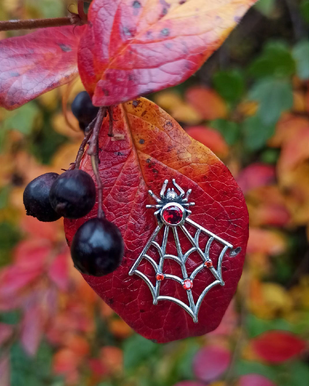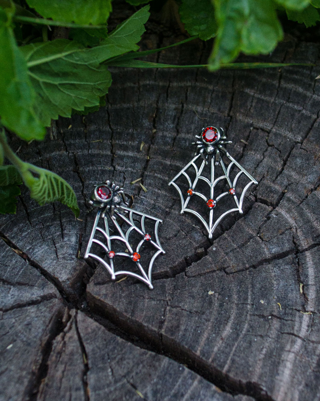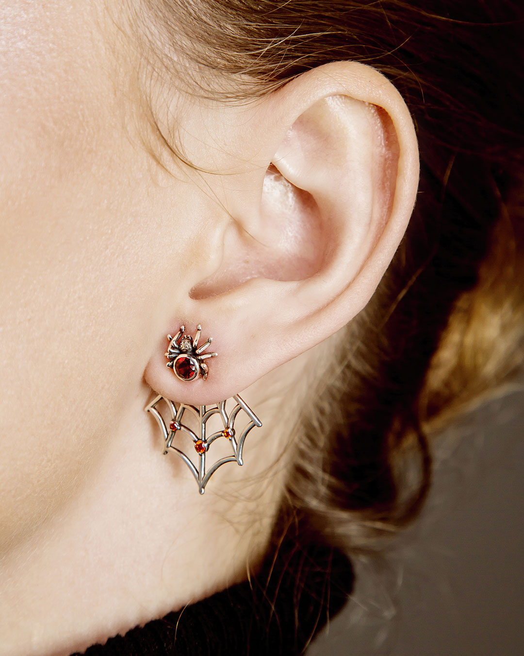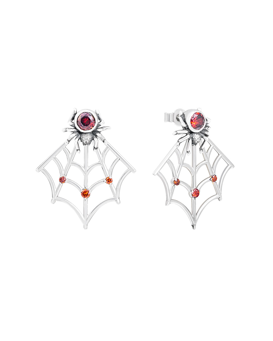 The spider web ear jackets are made of 925 sterling silver with an oxidized finish that highlights the lines of the web. Red cubic zirconia stones add a clear accent and make the earrings noticeable without looking heavy.