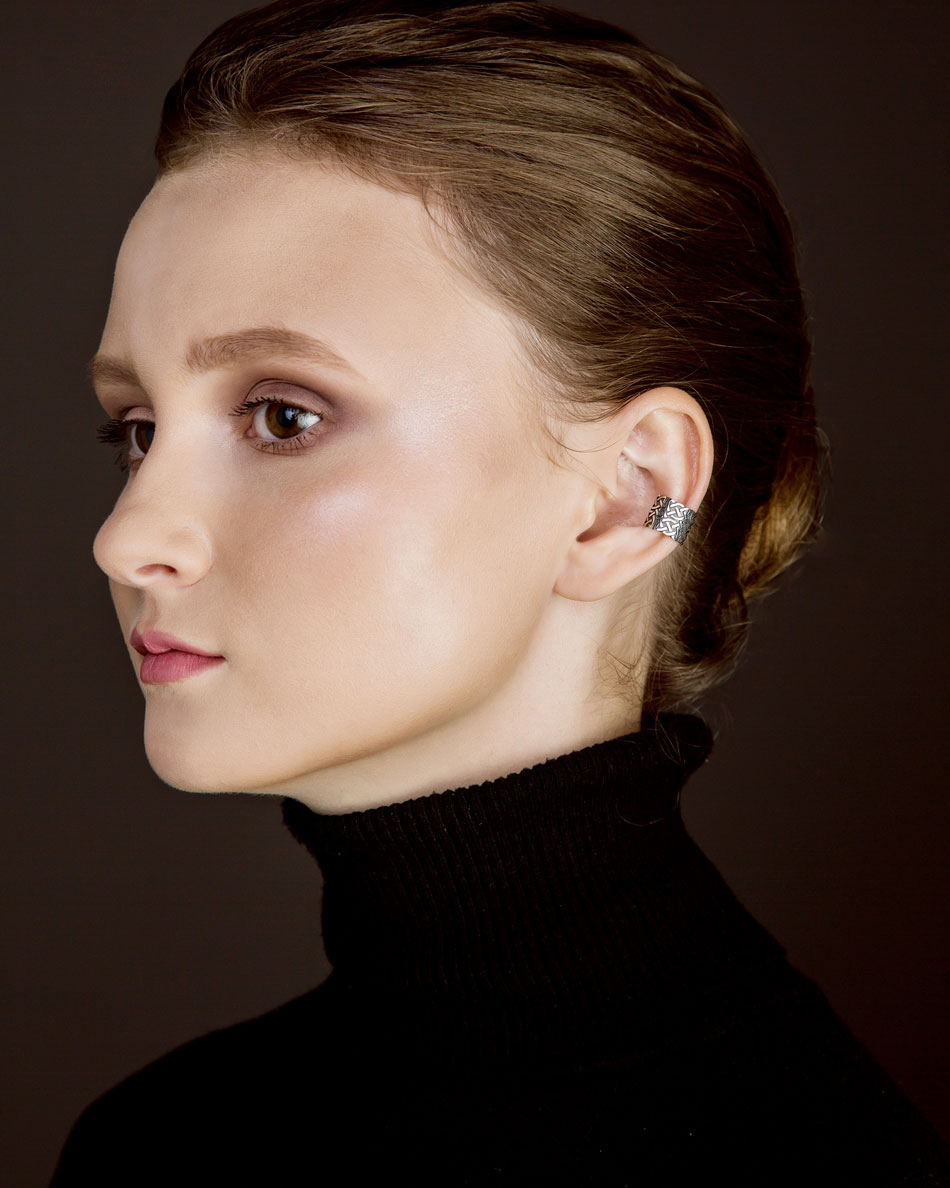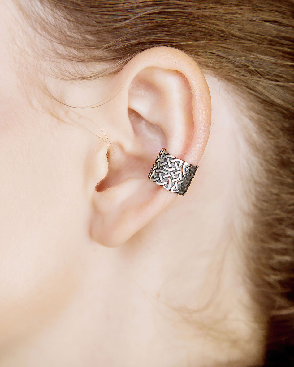 The wide celtic ear cuff is crafted from 925 sterling silver and features a detailed knot pattern inspired by traditional Celtic art. The oxidized finish highlights every line of the design, giving the cuff texture and depth. Its slightly oval shape follows the contour of the ear, which helps it sit securely and feel comfortable throughout the day.